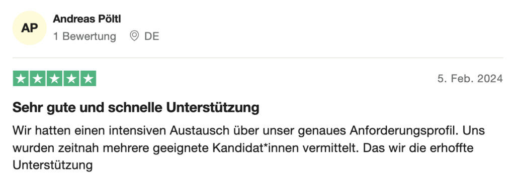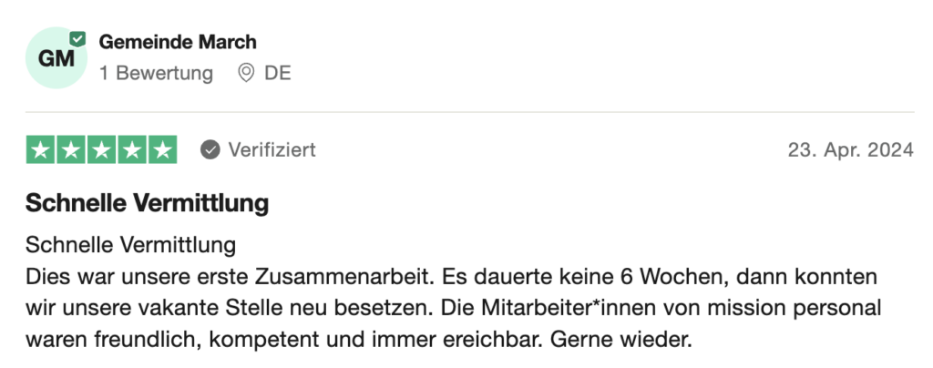„Die Professionalität und schnelle Vermittlung von Mission Personal führte zu erfolgreicher Rekrutierung.“